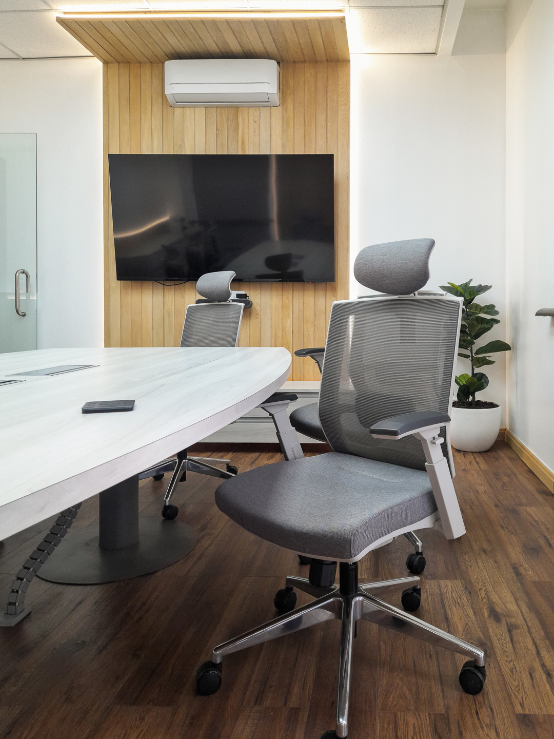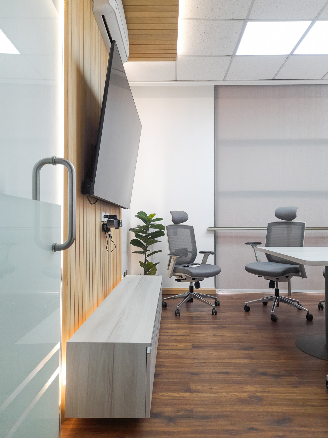 Un encargo flash que solicitó en 1 semana remodelar la sala de directorio de nuestro cliente, debido a una importante reunión extraordinaria que tendrían en 10 días con los directores y gerentes de casa central (Europa y Latam) en Santiago. Por lo que se diseñó en un par de días la intervención, y se montó rápidamente; cambiando piso y los revestimientos de muros, usando madera nativa de mañio y melaminas Santorini, en conjunto con iluminación LED, para generar una atmósfera más moderna y sofisticada. Se cambió mesa de reuniones y sillas, agregando unos muebles de apoyo laterales y frontales también con retroiluminación LED. Se canalizaron todos los cables y dejó operativa en 7 días corridos. Un éxito de coordinación y montaje.
